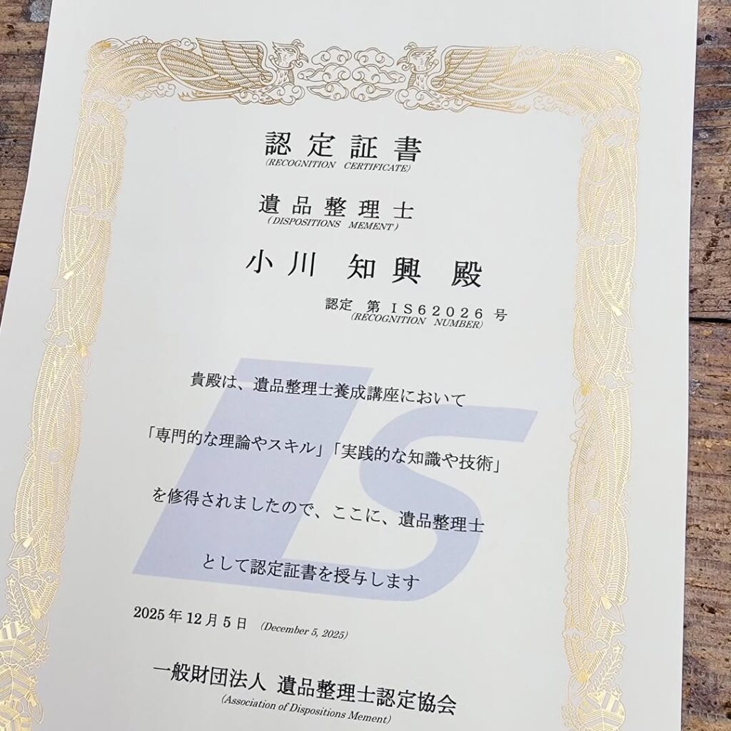 代表が認定資格「遺品整理士」を取得。不用品をただ捨てるのではなく、権利書や思い出の品の探索を行いながら、心の整理もお手伝いします。