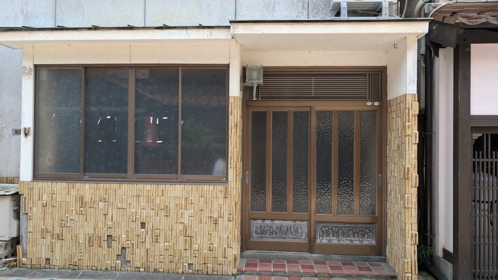 通りに面したファサード(正面)は、当時ならではのベージュ系の幾何学タイル張り。 窓には、今では希少な「型板ガラス(模様入りガラス)」が使われており、室内に柔らかな光を落とします。